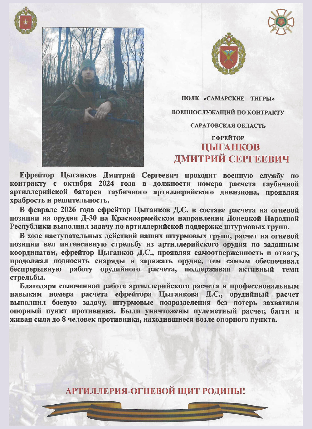 Как сообщается в официальном письме командования, ключевой эпизод, за который боец представлен к поощрению, произошел в феврале 2026 года на Красноармейском направлении Донецкой Народной Республики. Действуя в составе расчета на огневой позиции из орудия Д-30, ефрейтор Цыганков выполнял задачу по артиллерийской поддержке штурмовых групп.