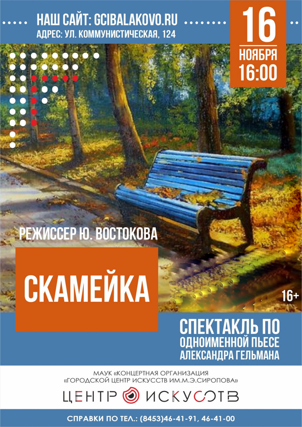 Спектакль «Скамейка» ждет вас 16 ноября в 16:00 в Городском центре искусств.
