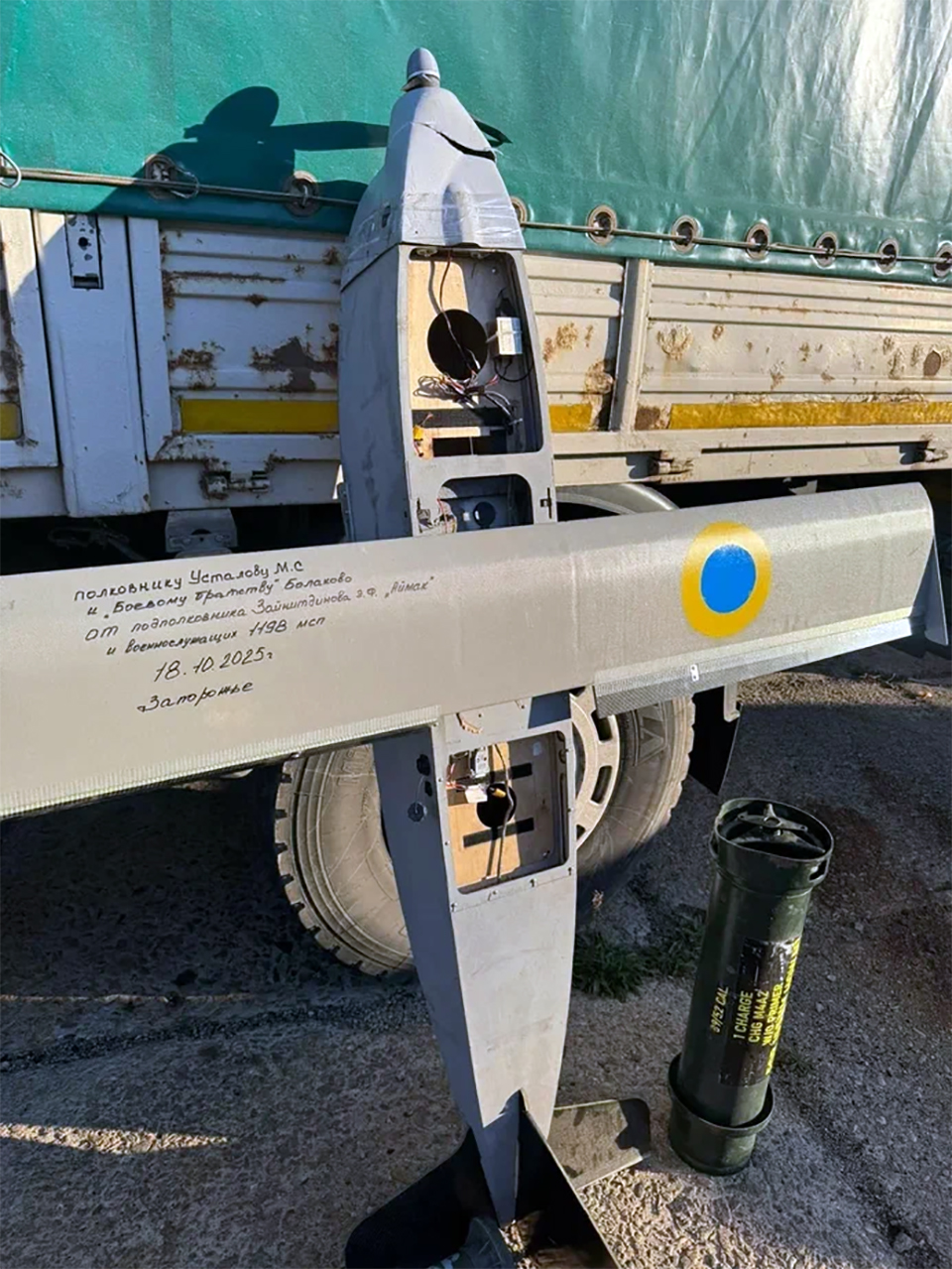 «Полковнику Усталову М.С. и «Боевому братству» Балаково от подполковника Зайнитдинова Э.Ф. «Аймак» и военнослужащих 1198 МСП. 18.10.2025. Запорожье».