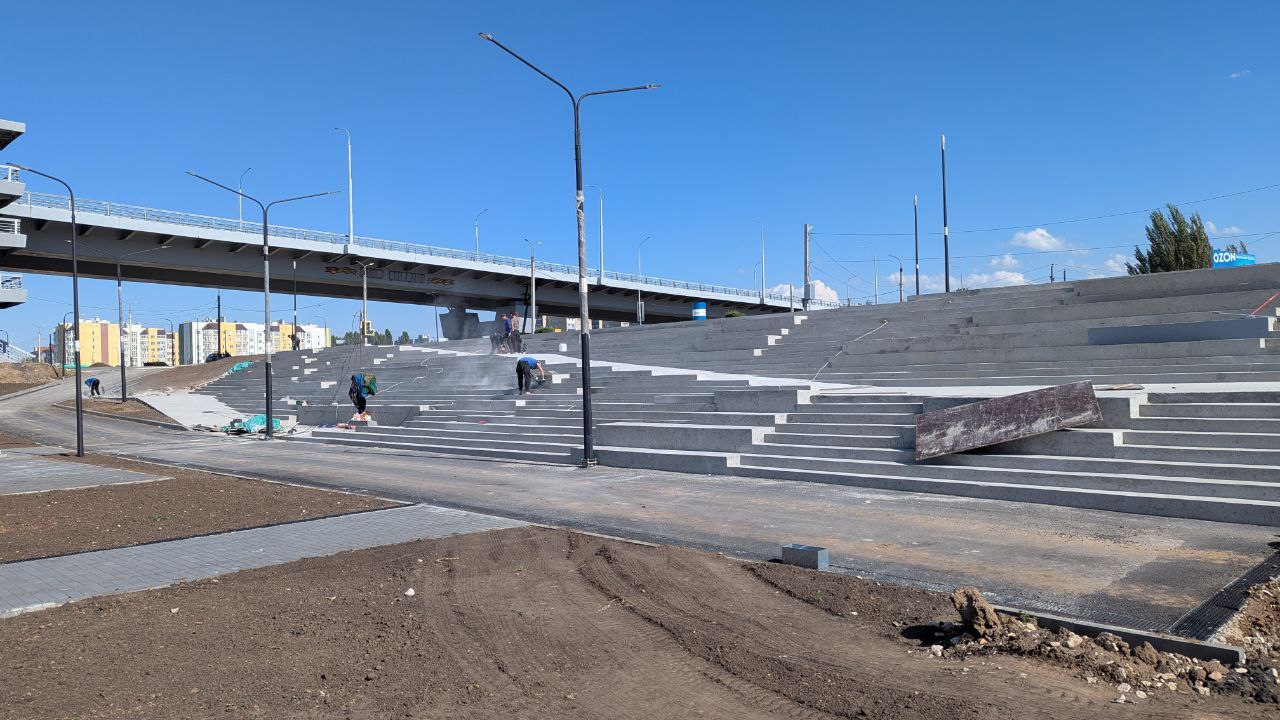 Новая набережная у моста Победы в Балаково обретает четкие контуры: устанавливаются фонтан и покрытие для спортплощадок