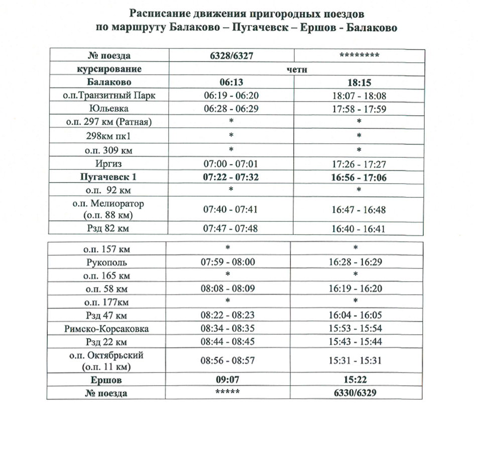 Для жителей восточных районов области актуален кольцевой маршрут Балаково – Пугачевск – Ершов – Балаково. Поезд № 6328/6327 курсирует по четным числам.