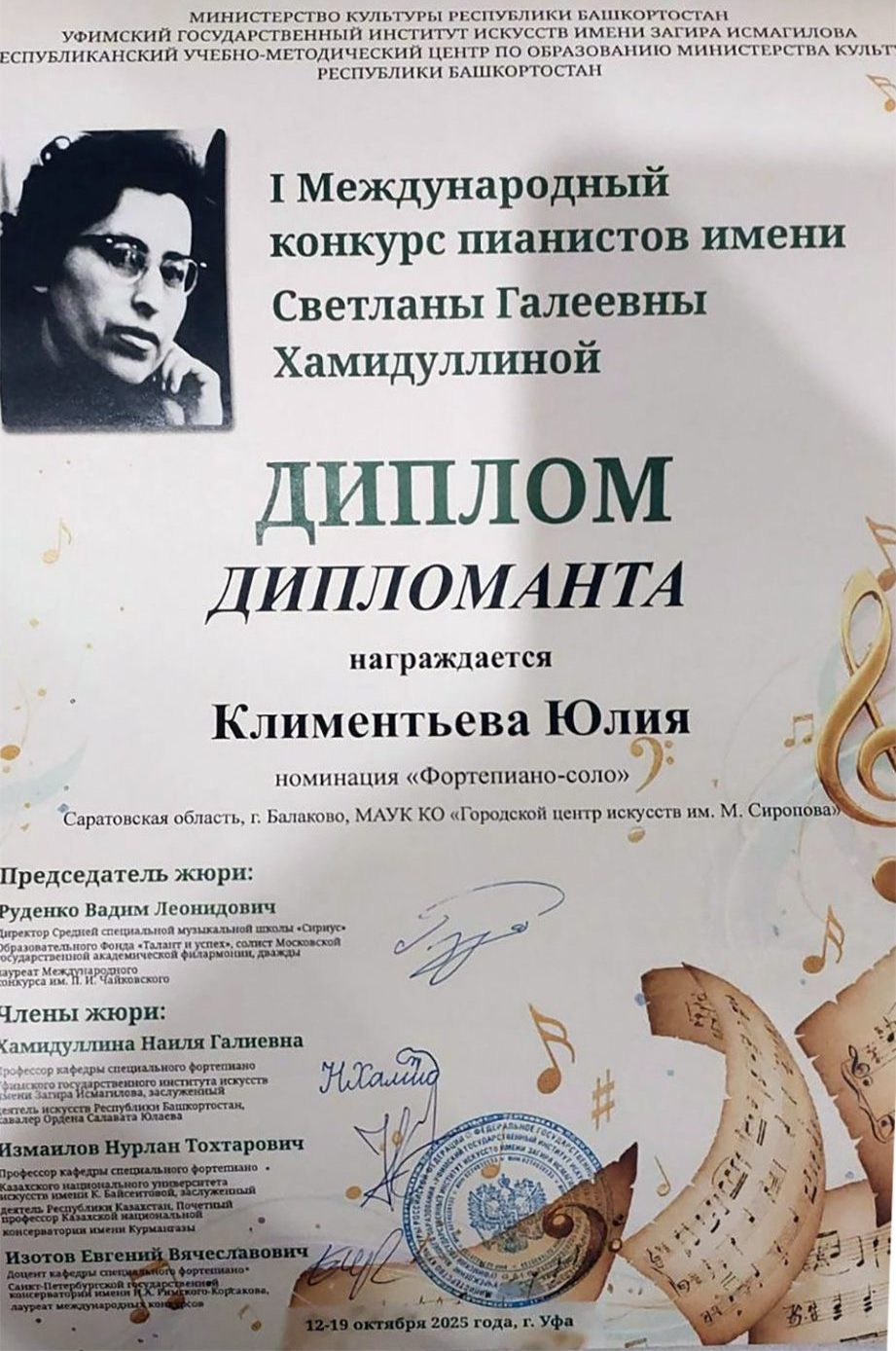 С 12 по 19 октября в Уфе прошел I Международный конкурс пианистов имени Светланы Галеевны Хамидуллиной, собравший 40 участников из разных городов России и Казахстана. Конкурс, посвященный памяти выдающегося музыканта и педагога, с самого начала задал высочайшую планку: жюри под председательством звезды мировой фортепианной сцены, двукратного лауреата конкурса им. Чайковского Вадима Руденко, оценивало выступления в стенах Уфимского государственного института искусств.