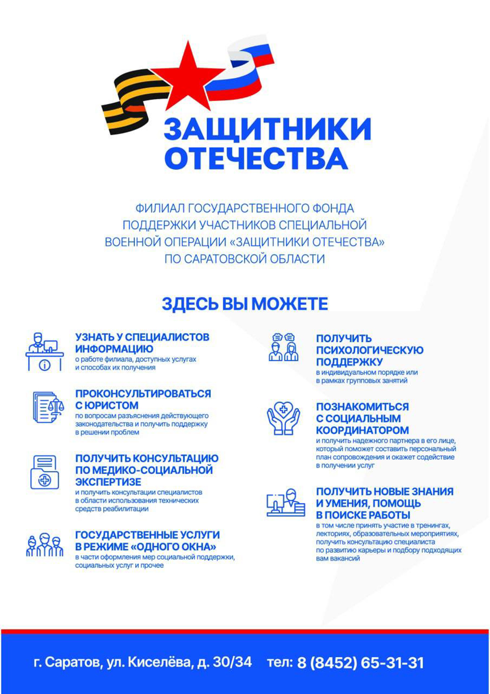 Филиал фонда предлагает широкий спектр услуг для военнослужащих и их близких. В Саратове и Балаково специалисты готовы оказать всестороннюю поддержку, включая юридические консультации, медико-социальную экспертизу, психологическую помощь и содействие в трудоустройстве.