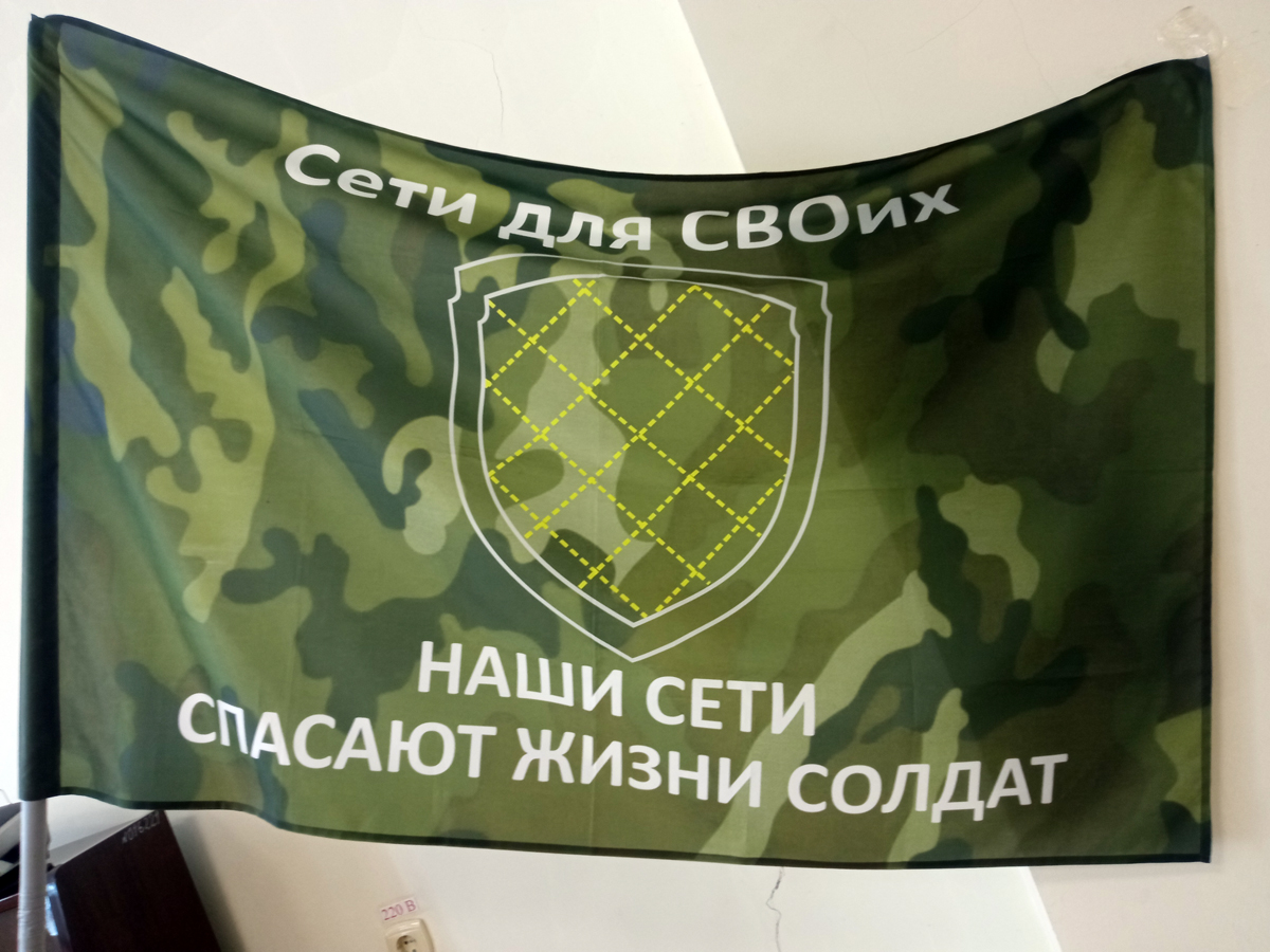 Доставкой готовых сетей на передовую также занимается «Боевое братство». Именно его флаг вместе со знаменем группы развернули волонтеры на памятном фото после завершения работы над тысячной сетью.