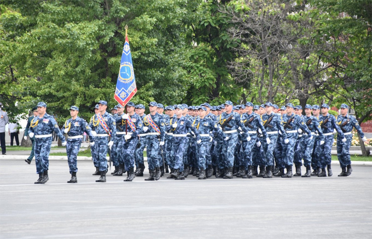 По площади маршем прошли военные летчики, курсанты, сотрудники полиции и Росгвардии, таможенники и казаки. А над пешим парадом пролетели три бомбардировщика Ту-95МС, а затем Ту-160 с дозаправщиком Ил-76. Они направились на парад Победы в Москву.