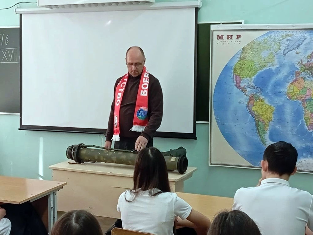 Несмотря на серьезные ранения, полученные в ходе боевых действий, Василий Сергеевич продолжает активную деятельность по патриотическому воспитанию молодежи. В этот раз он не только провел занятие с восьмиклассниками, но и сделал весомый вклад в музейную экспозицию учебного заведения.