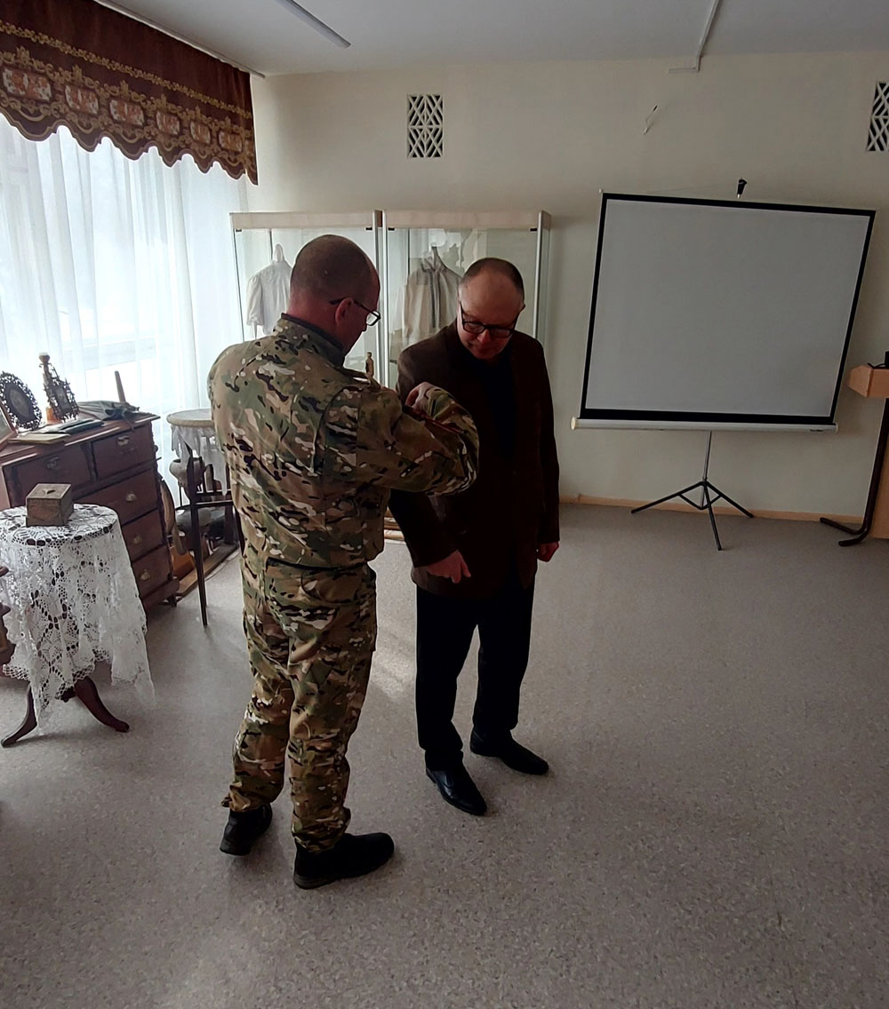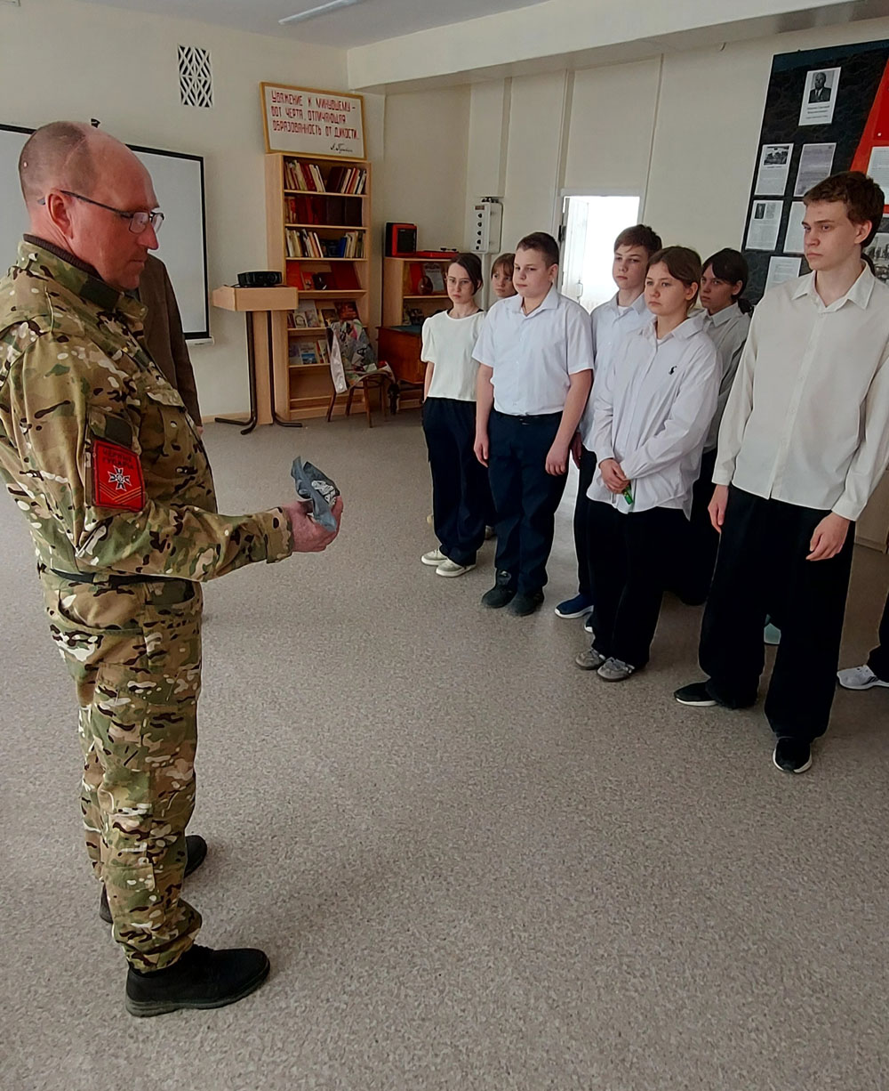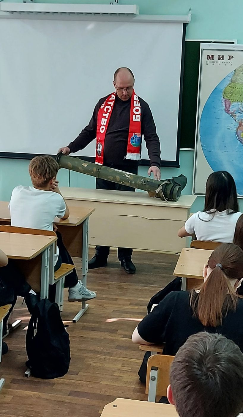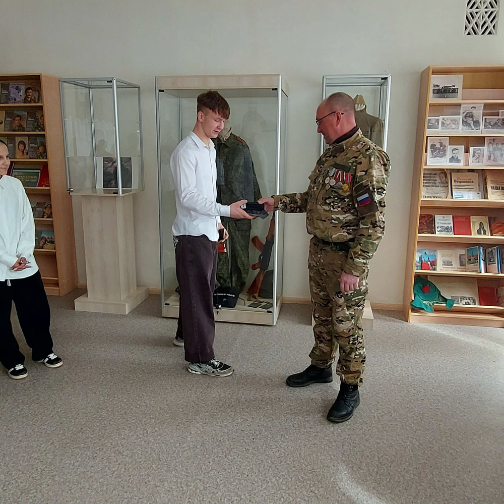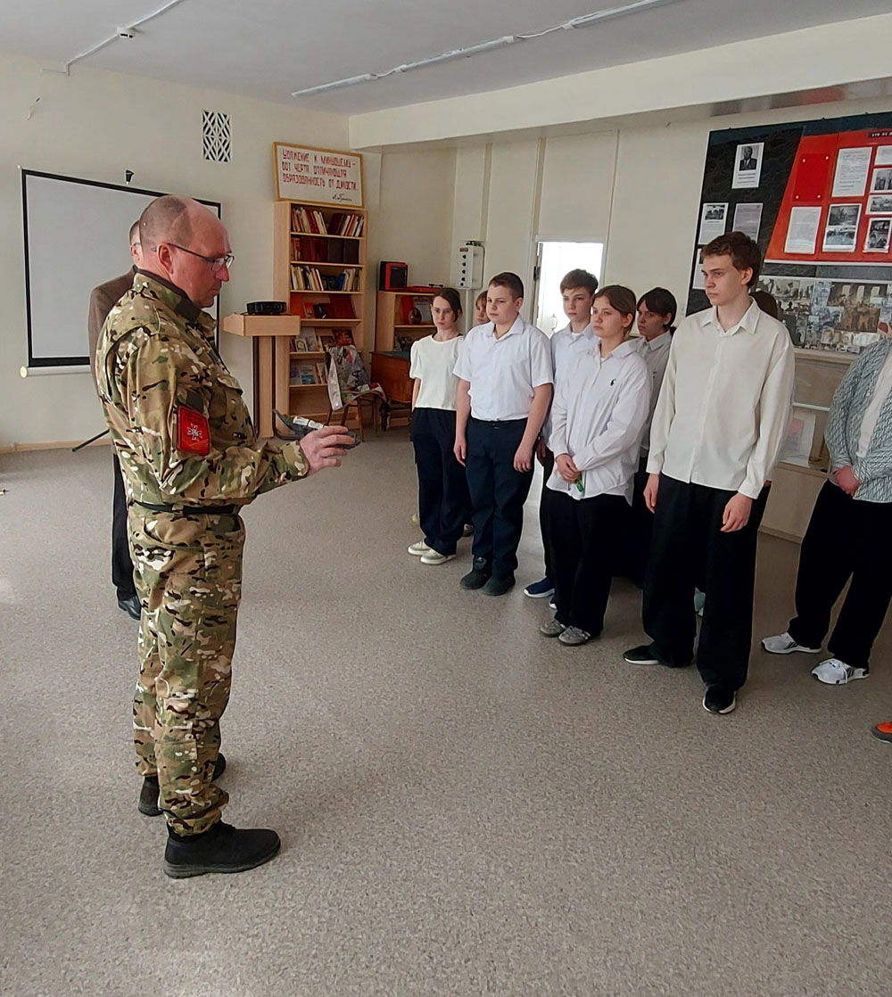 Несмотря на серьезные ранения, полученные в ходе боевых действий, Василий Сергеевич продолжает активную деятельность по патриотическому воспитанию молодежи. В этот раз он не только провел занятие с восьмиклассниками, но и сделал весомый вклад в музейную экспозицию учебного заведения.