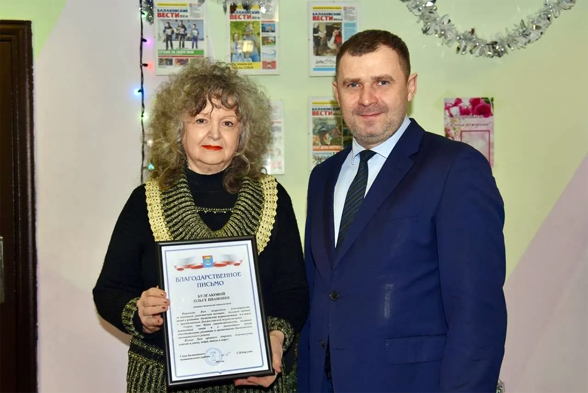 Глава Балаковского района Сергей Барулин вручает Ольге Булгаковой Благодарственное письмо